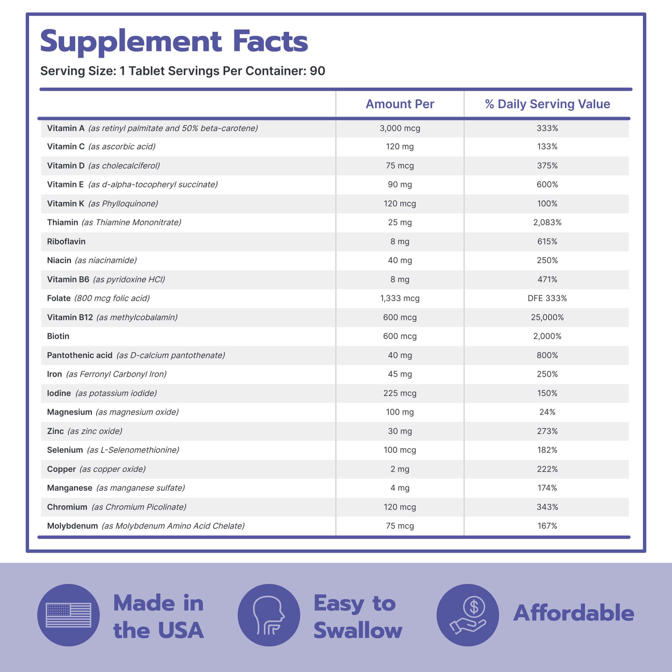 - Just One Chewable Multivitamin – Includes all essential nutrients with 45 mg iron in a great-tasting berry chew